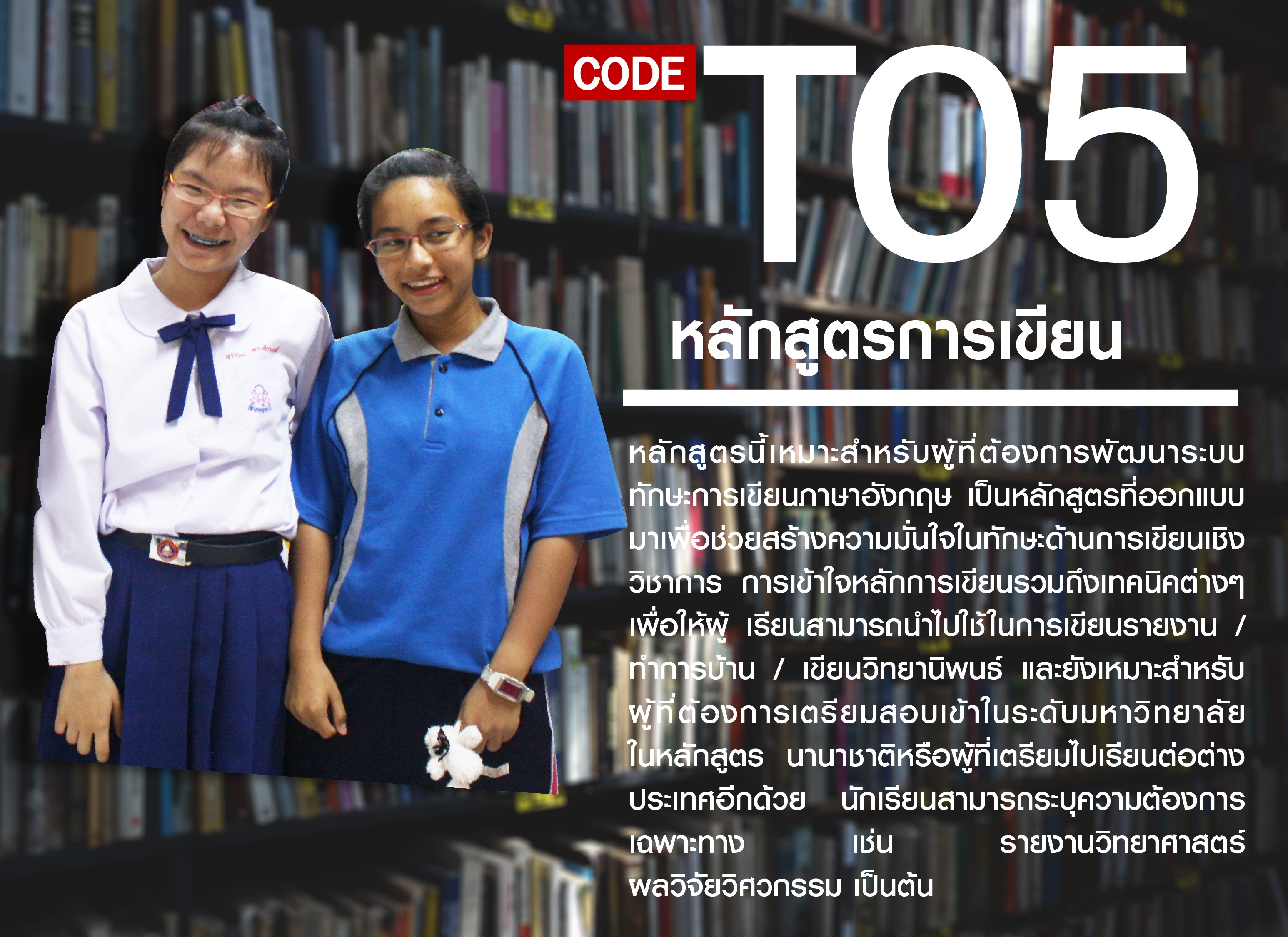 หลักสูตรการเขียนสำหรับนักเรียนนานาชาติ เพื่อพัฒนาระบบทักษะการเรียนภาษา การเขียนภาษาอังกฤษ แกรมม่าอังกฤษ รวบรวมเทคนิคต่างๆ เพื่อให้เขียนรายงาน การบ้าน พรีเซนต์งาน ฯลฯ เรียบเรียงได้อย่างสละสลวยและถูกต้องตามหลักไวยากรณ์อังกฤษมากยิ่งขึ้น หลักสูตรนี้สามารถครอบคลุมความประสงค์เฉพาะเจาะจง โดยนักเรียน สามารถระบุความต้องการเฉพาะทาง เช่น การทำรายงานวิทยาศาสตร์ ผลวิจัยการวิศวกรรม หรือฝึกการเขียนเพื่อเตรียมความพร้อมสำหรับเตรียมสอบนานาชาติ เป็นต้น